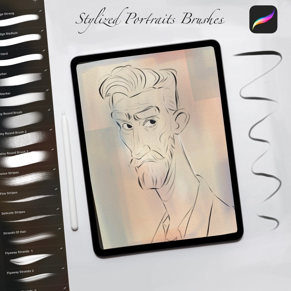 A brush set for creating stylized digital portraits in Procreate. These brushes are perfect for drawing soft outlines, painting skin and hair, and smooth blending. The set also includes paper-texture brushes to add depth and a unique touch to your portraits.