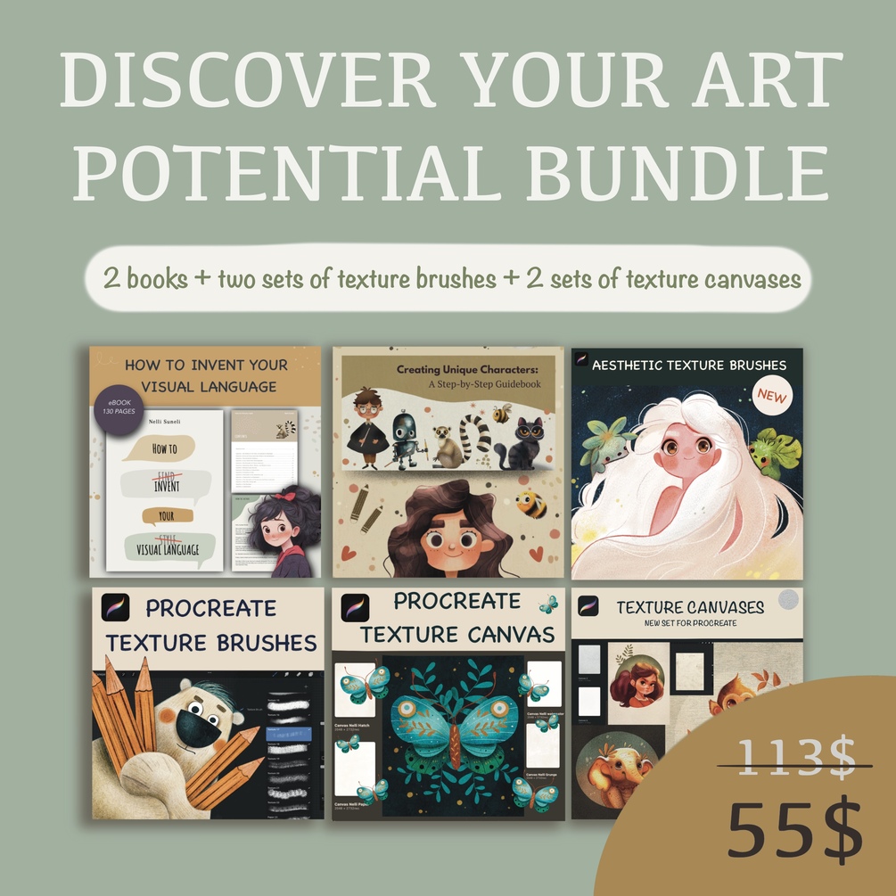 1) How to find your style (crossed out) visual language. 2) Creating Unique Characters: A Step-by-Step Guidebook. 3) NEW Aesthetic Texture Brushes 4) Texture brushes for Procreate 5) Procreate Canvases 6) Texture Canvases New Set For Procreate